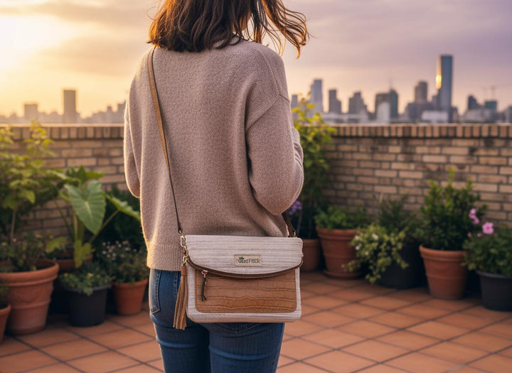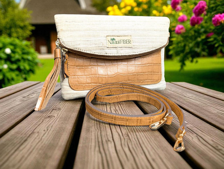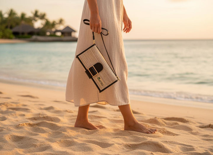 Handcrafted from delicate banana fiber fabric, this clutch bag showcases the natural beauty and strength of sustainable materials. It features pure leather accents that add refined texture and elegance, complemented by a soft cotton canvas lining for durability and comfort. The pure-woven design highlights artisanal craftsmanship, making it a sophisticated accessory that combines eco-consciousness with timeless style. Perfect for those who appreciate unique, sustainable fashion with an understated yet luxurious appeal.